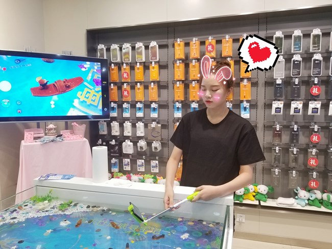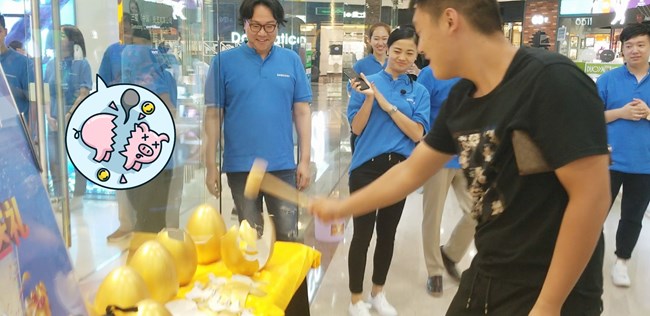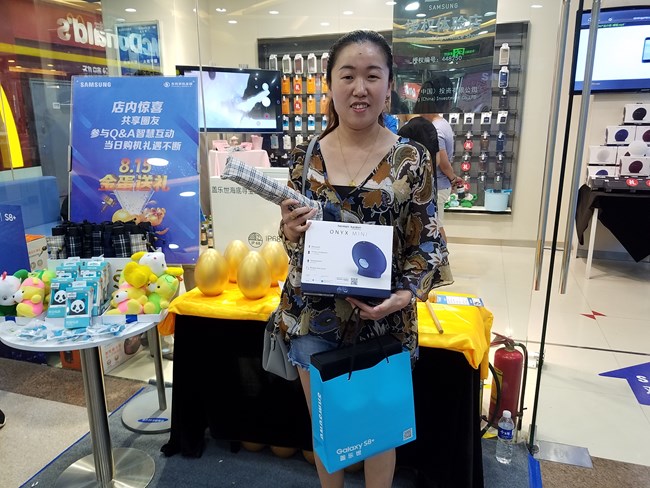 今天参与购机的粉丝现场能获得哈曼音响外,并且还可以进行现场砸金蛋的活动,这位女顾客砸金蛋获得三星定制雨伞。