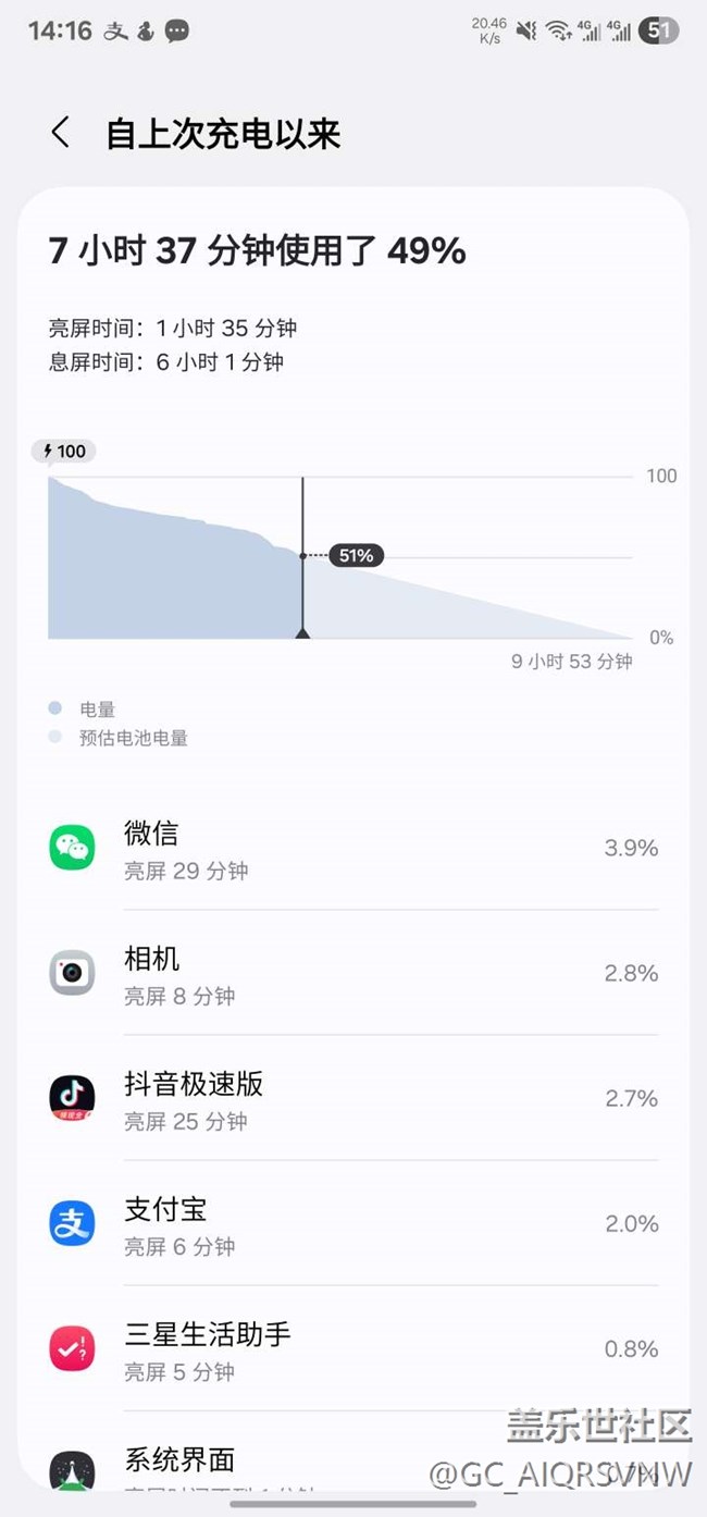 - 耗电量49%亮屏时间1个半小时,待机6小时还行吧