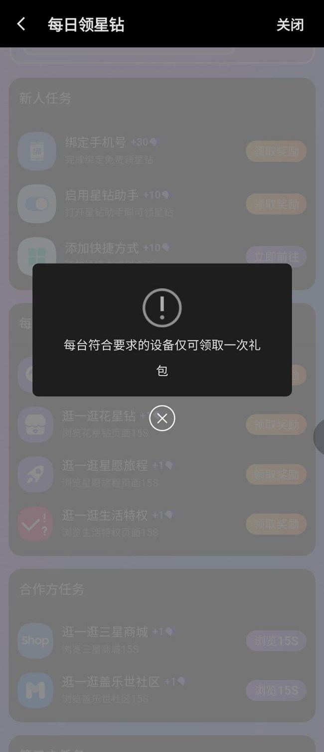 星钻领不了,每日的任务显示设备只能够领取一次