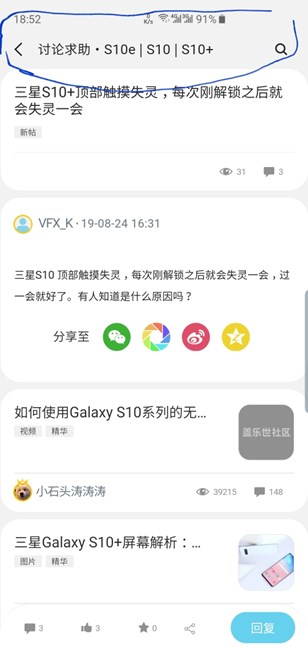 三星S10+顶部触摸失灵,每次刚解锁之后就会失灵一会