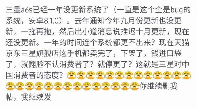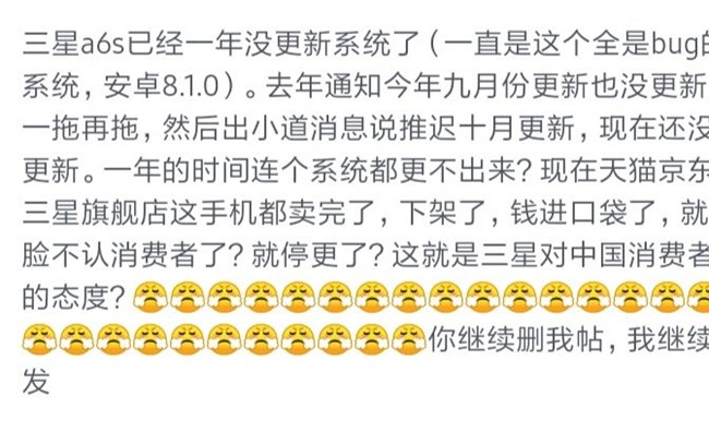 三星a6s更新比世界末日还遥远。这是第一个三星手机,也是最后一个。如果身边的人买手机,我会建议第一个排除买这个牌子的手机。