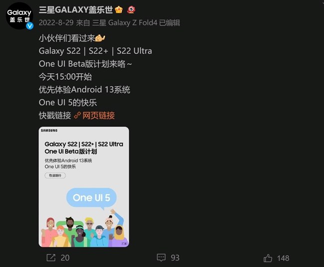 ONE UI 5.0 内测是去年8月29日15:00开始的: