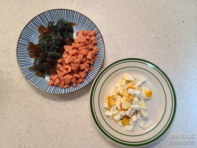 咸鸭蛋,松花蛋,火腿肠切丁备用