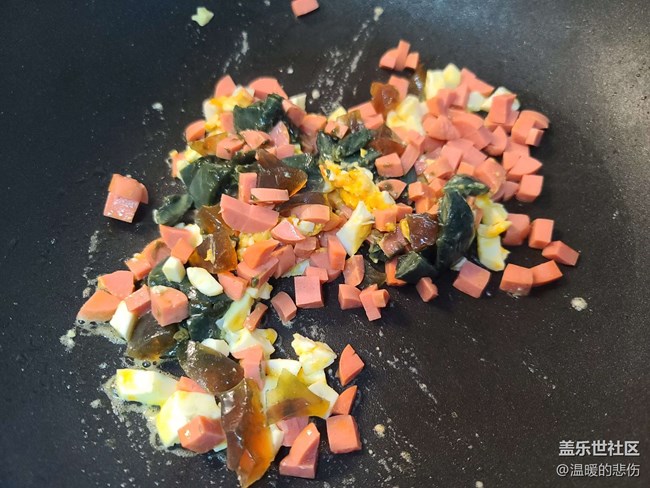 倒入火腿肠和松花蛋翻炒下