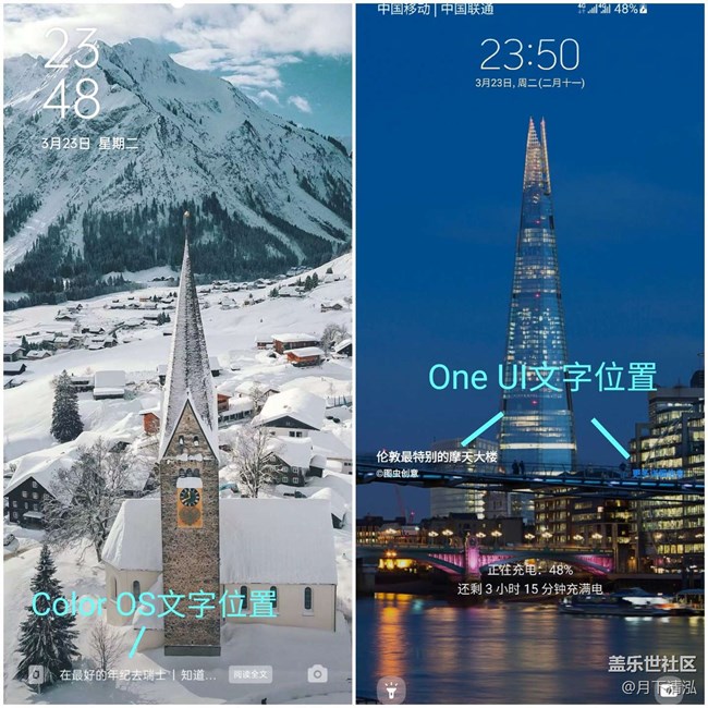 智能锁屏壁纸的图源标注及更多详细信息按钮的位置对锁屏美感的影响是毁灭性的。合着Lockstar自定义锁屏、Quickstar自定义时钟皮肤无限提升锁屏观感,到头来被这一东西给毁于一旦,太可惜了。当然也不是无脑建议把它们删掉,毕竟版权问题,个人觉得也做不到,但可以集各家之长,参考Color OS将文字放在锁屏两个快捷方式之间的位置,再减小字体大小,置于底部,观感大大提升。至于更多详细信息按钮,真的容易误触,点开还一堆广告,有时手和手机一起放在口袋里,拿出来点开一堆稀奇古怪的东西非常头大,这里就可以参考老的Funtouch OS做法,锁屏不显示详细信息按钮,只有右滑调出壁纸浏览时才显示更多详细信息。如果允许的话,可以做的极致些,将图片标题也置于右滑时才显示,那么锁屏只有底部一个图源信息的小字,加上Lockstar对组件的美化,真正意义的杂志级美感的锁屏界面得以实现。
