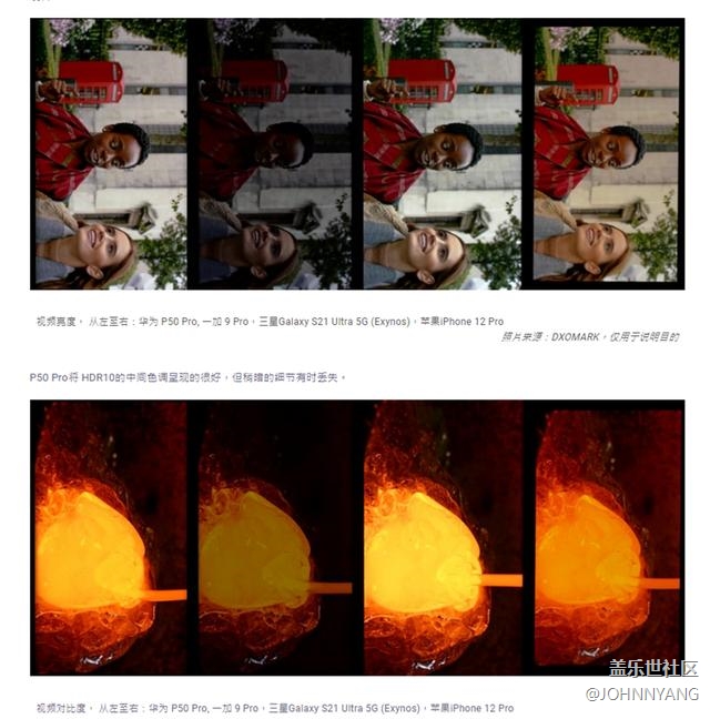 从DXOMARK公布的一些测试场景来看,首先在DXOMARK慢动作视频的屏幕闪烁测试中, 华为P50 Pro的PWM频率为1448赫兹(人眼不可见),能有效控制闪烁。而三星Galaxy S21 Ultra 5G(Exynos)闪烁频率则为240赫兹。
