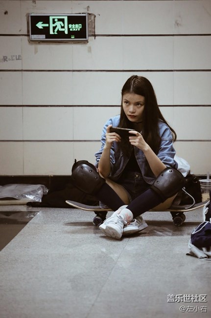 在空旷的通道享受着自己的滑板时间