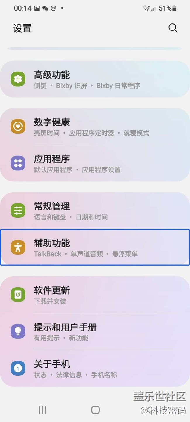 在三星的辅助功能里,有一个Talk back功能,开启这个功能后,有视力障碍人群就能更好的使用手机,它会为你读出每一部的选项内容,这个只需要听手机播放就能控制手机了!很人性化!