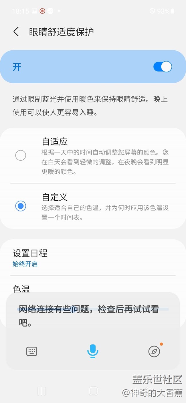 智能手机应该是现在每天用的最多的数码产品了,追剧,打游戏,刷视频,每天都要盯着手机好几个小时,你可能跟我一样眼睛也会不舒服,最近在使用三星Galaxy S21 FE 5G,它呢有个智能护眼模式挺不错的,可以有效减少有害蓝光,减轻我们在使用手机时双眼产生的疲劳感。还可以自定义调解到你看着最舒服的状态!可以更好的呵护我们的眼睛!
