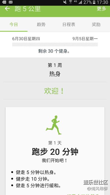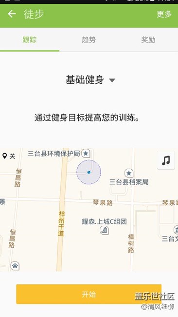 启动S健康,非常简单,打开桌面——找到sasmung————S健康——进入——,以后自行选择锻炼方式,由系统帮你设定训练计划。今天,以徒步初始训练为例,见截图。