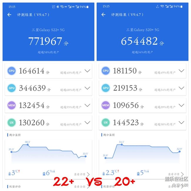 ❷两个手机测试中都进行风冷降温,测试中三星20+测试比较快三五秒左右