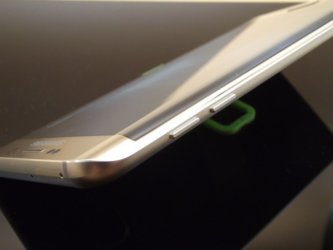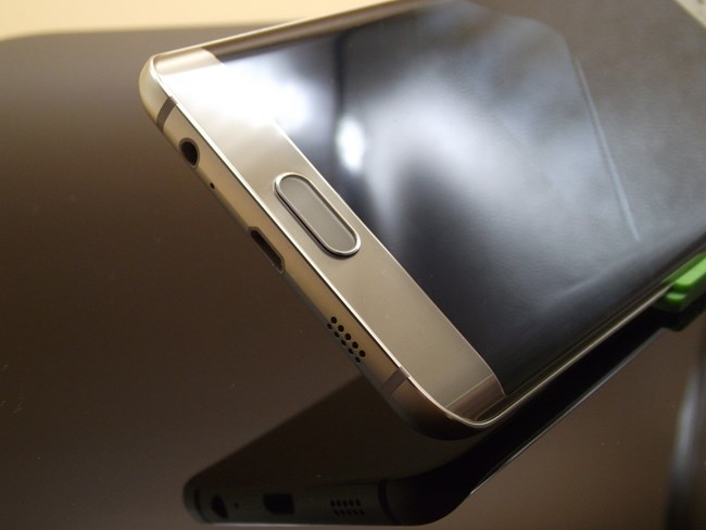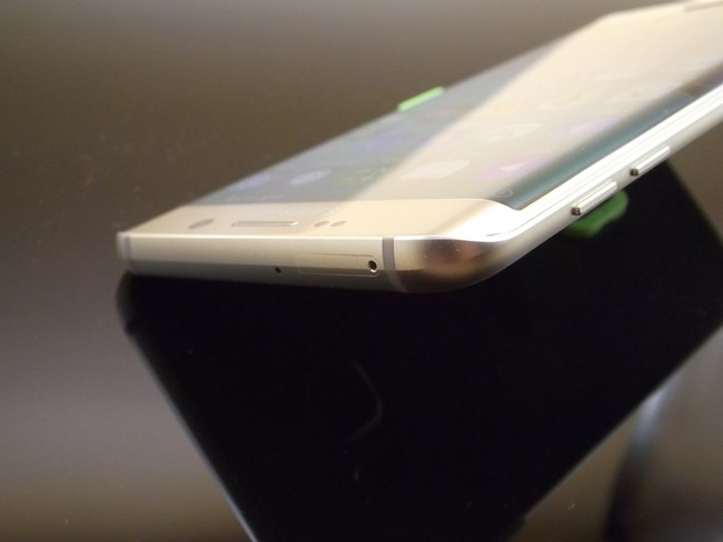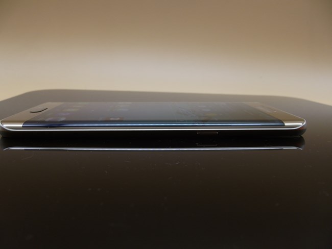 侧面没有地方,EDGE+除了按键以外所有的接口和扬声器都在上下两个顶端集中,这里其实想说的是边框的处理,它的圆角过度再加上一个模纵面的切线,这样的设计处理,让手机多了一份阳刚。