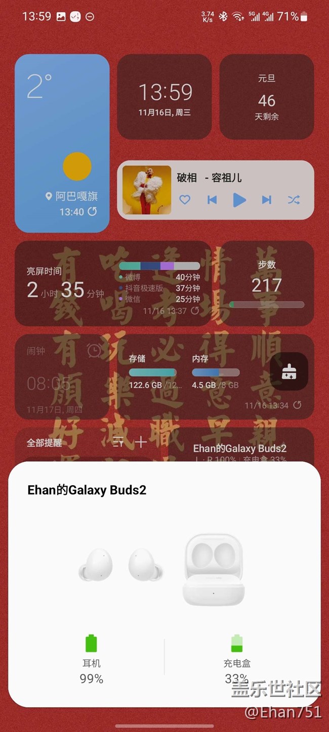 2021年11月,第一次购入三星无线耳机------Galaxy Buds2,被它小巧的外观所吸引,而戴在耳朵里的舒适度,也刚刚好。如今使用已有一年时间,真的很感谢三星这款产品给我生活带来的改变,我是一个喜欢在出行戴耳机听歌的人,而Buds2的功能完全符合我的所有期待。当我开启降噪后,整个地铁都听不到喧闹,完全被美好的音乐所包围;开启环境音与人交谈时,一切又是那么清晰,仿佛耳朵上没有任何的阻碍;当我开启双击耳机边缘功能时,轻轻敲击耳廓,便可实现调节音量的操作;当开启读出通知时,不方便看手机消息的时候也能快速掌握 ,不漏掉每一条信息。三星的产品创造力真的很强,没有一个功能是多余,它的实用性大大改变了我的生活,真的很感谢有三星产品陪伴在身边,愿三星越来越好