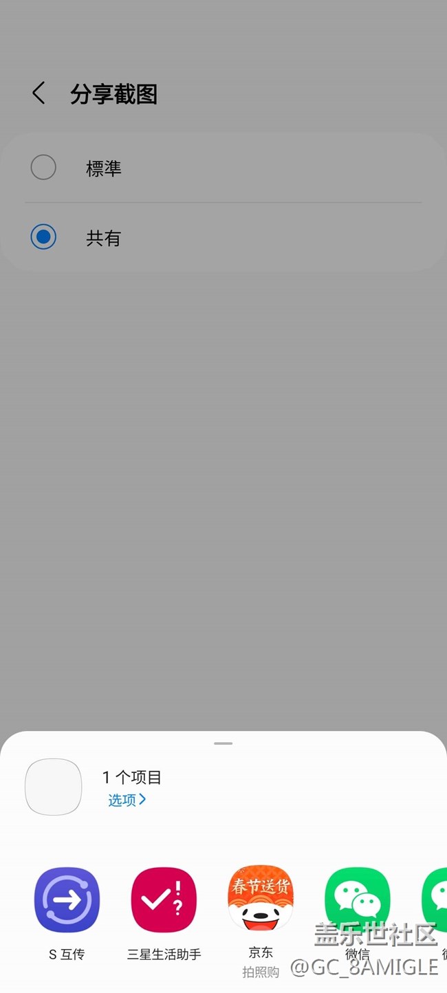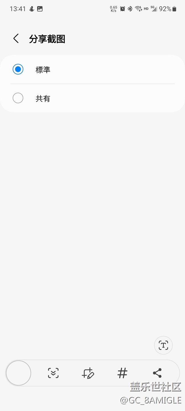 4.以截图为例,截图有两个选项,一个选项是标准,就是通常化截图,可以进行长截图。还有一个选项是共有,指的是截图完立即出现分享界面,可以快速分享到你想要的地方,比如微信,S互传等等。注意看两种模式下最下方弹出来的界面内容的区别