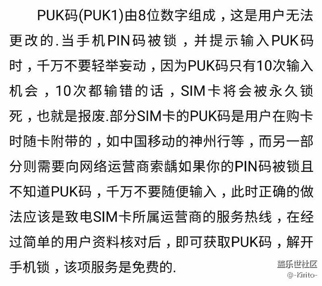 今天手残,突然想试试自己还记不记得PIN密码,结果试了三次之后,全部失败了,现在手机卡都用不了,一插上就锁机。。网上查了之后,发现自己知道的太晚了,(如图:要提前获取PUK码)估计明天只能去营业厅换卡了,在这里发帖希望提醒一下其他小伙伴们,不要学楼主作死,作死至少一定要做好充足的准备,就这样。。楼主还是早点洗洗睡吧,明天还要早点去营业厅。。。晚安各位!