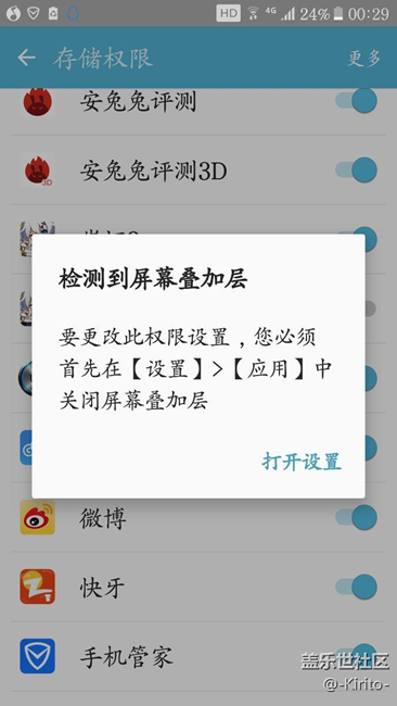 如题。因为这个所谓的屏幕叠加层好多应用都用不了了,之前用管理器还可以授予权限。但是,更新了补丁之后就没法用了。。求大神解答!