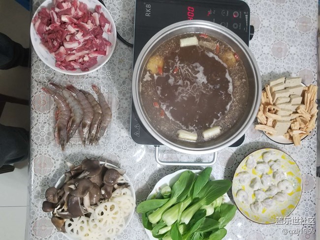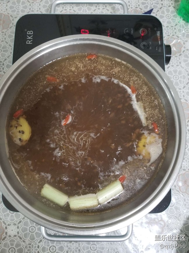 我家一般用电陶炉,蹲上一个盘,放入一个底料,加入枸杞、葱、姜段就成。