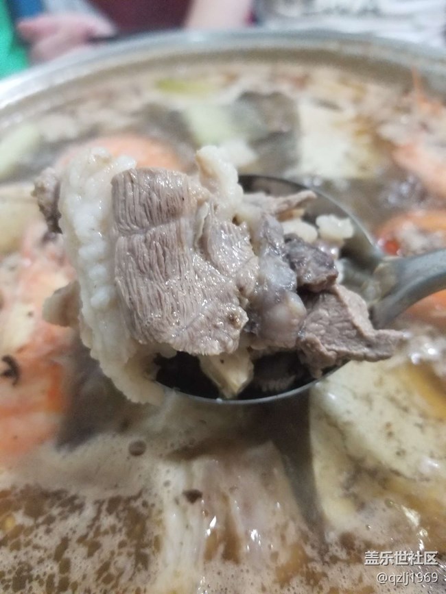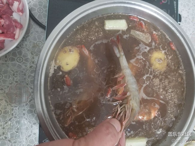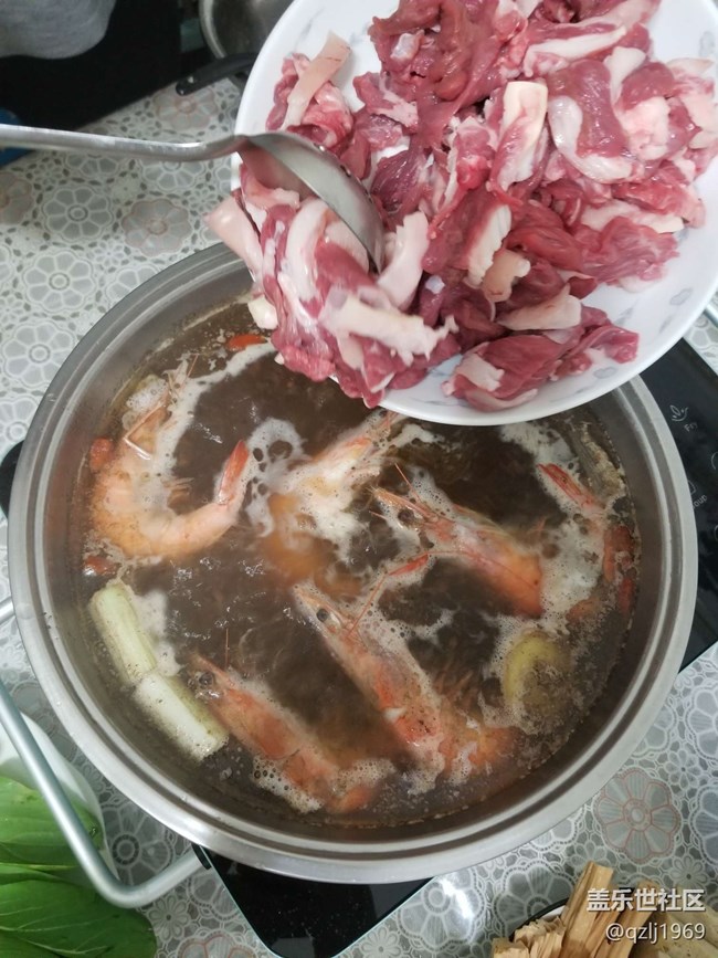 先放入大虾,再加入羊肉。