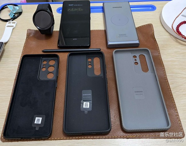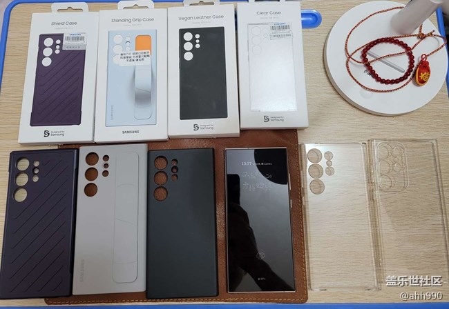 换S24U的同时购买了四个官方壳、价格依次从高到低分别为:灰色腕带硅胶壳、黑色生态皮壳、墨紫色盾型壳、亚克力透明硬壳。今天下午分把四款官方壳套上手机进行了体验,希望能给到一些打算入手S24U官方壳星粉的建议,下面是个人体验结论:第一款官方腕带硅胶壳用的是液态硅胶材质,手感很舒适,没有任何异味,对手机正面边框还是背面的摄像头保护包裹都非常到位,背面的腕带是伸缩调节式的,起的主要做用是支架固定,类似行李箱壳的支架功能,但功能没有S行李箱的支架强大,喜欢追剧的星粉建议选这款。第二款官方生态皮壳,手感是这四款官方壳中最好的,对手机背面摄像头保护到位,为了方便拆卸的原故,正面左右两侧没有对边框进行完全包裹,是低于手机左右两侧边框的,顶部、底部是包裹到位了的,24U生态皮壳材质虽然不是21U那样的牛皮,个人感觉比21U牛皮更耐用,用过21U官方皮壳的星粉都有体验,棕色最多2个月就发黑还娇气,黑色虽然不会发黑,娇气跑不了,稍微接触一下其它物品就会留下无法消除的痕迹,这4天我主要用的是24U的生态皮壳,生态皮材质就不会轻易留下痕迹,只需避免跟尖锐物品接触,追求手感舒适度的星粉建议选这款。第三款官方盾型壳,有些类似行李箱的感觉,材质是环保塑胶类,没有异味,对手机正面边框和背面摄像头的保护包裹都相当到位,墨紫色比较耐看,颜值虽然没有灰白色盾型壳高,但使用时间长了右侧的音量键和关机键位置不会发黄,这还是卖家告诉我的,不然我也选灰白盾型壳了,追求对手机保护到位的星粉建议选这款。第四款官方亚克力透明硬壳,用的材质是高透硬塑料,对手机正面边框保护非常到位,背面对摄像头的保护也还行,透明壳底部不是全包,硬壳全包手机就非常不好拆卸了,透明壳非常紧拆取时要小心一些,避免划花手机边框,透明壳手感比较丝滑,要注意失手滑落,硬壳旁边的透明硅胶软壳是购买官方透明壳时卖家赠送的,非官方壳这里就不做评测了,追求经济实惠的星粉建议选这款。小结一下:22U及之前的支架式行李箱壳是功能最强,对手机保护最到位的官方保护壳,遗憾的是从23U系列开始就不生产了,唯一缺点就是厚重了些。最后五图是备用机21U的官方壳,棕色全新时和用了20天后前后对比,最后一图是两个21U官方黑色真皮壳,一个正在用已经用了半年多了,对比用了20天的棕色壳,2021年当时黑色、棕色都是同样的售价,真的很无语,有过这样的体验后我对三星官方皮壳黑色是首选,另外一个是全新仅拆封未使用的21U官方黑色真皮壳,换24U前留做备用的,现在看来有些多余了
