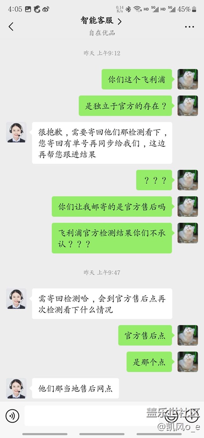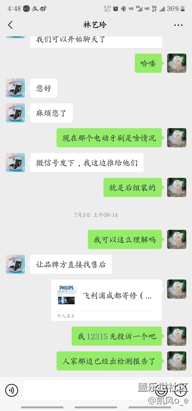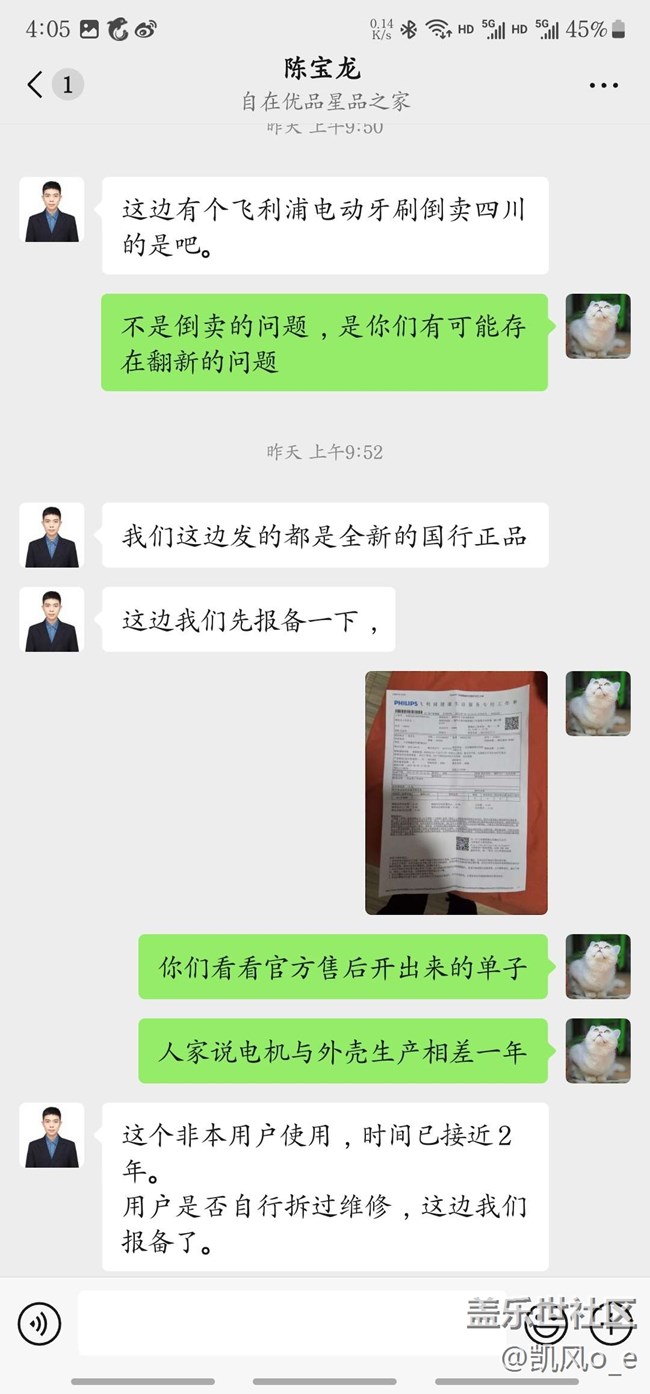 得知无法维修变第一时间联系到星品之家客服,客服最开始说联系经销商,随后又让我加个人微信,然后又在个人微信中聊让我把牙刷和报告邮寄给一个私人地址。整个过程星品之家客服没有一次主动联系我解决问题,概不承认飞利浦官方给出的报告,还怀疑我倒卖牙刷我自己拆开牙刷。最让我不理解的是这个星品之家客服竟然疯狂到核查我的三星账号。已经12315投诉。