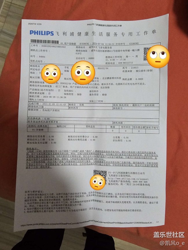 随后联系飞利浦官方,飞利浦表示牙刷有2年质保,便邮寄返厂维修。维修结果显示:经工厂核查,用户手柄的内外机号不匹配,无法保修。