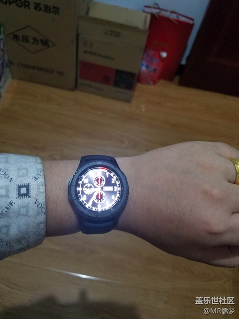 说说刚拿上的感觉吧,首先是大其次是重。我胳膊够粗了戴上这个表都感觉撑不起来,穿衬衣肯定没法系扣子。表带说实话不是很舒服,幸亏京东众筹一款鳄鱼表带,这才配的是咱的S3。