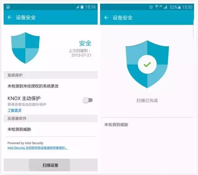 三星智能管理器提供了设备“病毒扫描”以及“Knox主动防护功能”,管理器带有Knox主动保护软件服务。