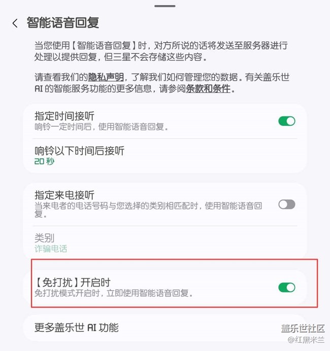 经测试,。勾选图中:免打扰 开启时 这个选项的时候,智能语音回复并不会被激活