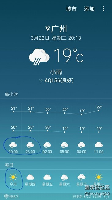 刚刚看了网友发了关于天气预报的问题贴,我特意去看了看自己的手机,结果真的是有问题,来看看今天的天气情况。无语了,真实情况是几乎白天都在下雨,那来的晴天?