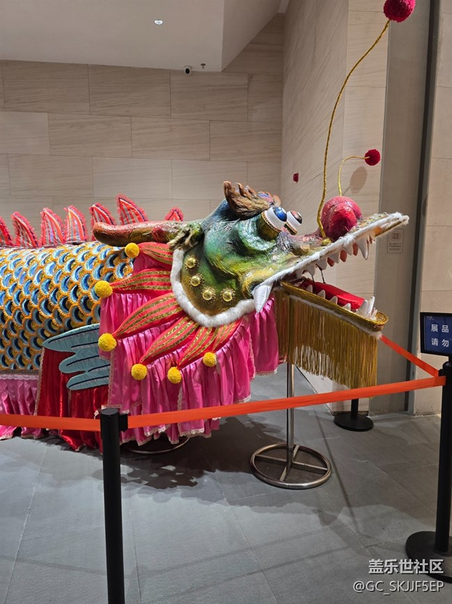 而那巨大的舞龙道具更是震撼人心。龙头栩栩如生,张开的大口似要吞云吐雾,锋利的牙齿、圆睁的双目,搭配色彩斑斓的龙身,鳞片、龙须都制作得极为精细。粉色的装饰为这条巨龙增添了几分灵动,让人不禁联想到舞龙时那气势磅礴的场景,龙珠引领,巨龙翻腾,尽显中华传统文化的魅力。