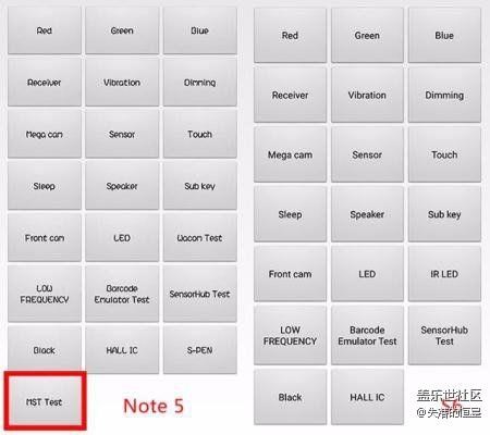 有机器的小伙伴们也可以测试下自己手里的S6,在拨号键盘输入“*#0*#”进入手机的测试模式,Note 5是会显示有MST测试的,而S6没有。