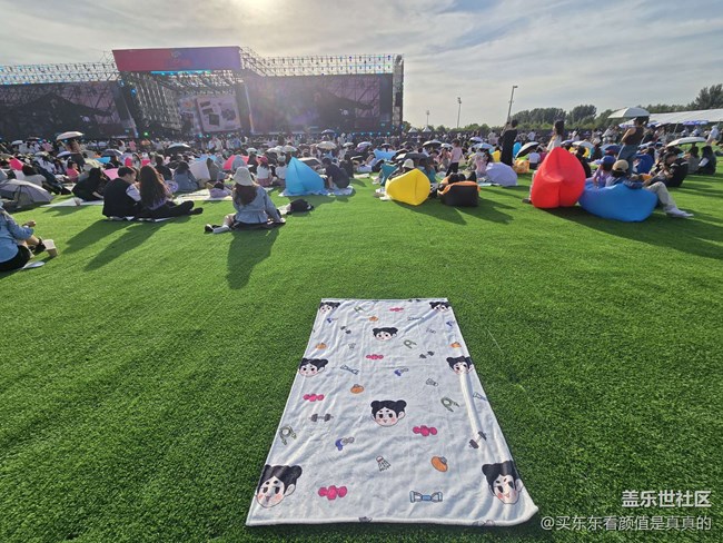 《乐见·潮向》音乐嘉年华的门票抽到了,感谢,音乐节现场好热闹,场内草地绿油油的,大家或坐在野餐垫上,或躺在充气沙发里,惬意地等着演出开始。舞台上歌手倾情演唱,大屏同步画面,方便远处的观众观看。现场还有各种品牌展位,像三星的蓝色展位就很亮眼,先打个卡。