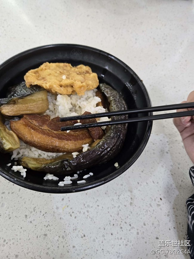 把子肉,茄子,米饭,黑色碗