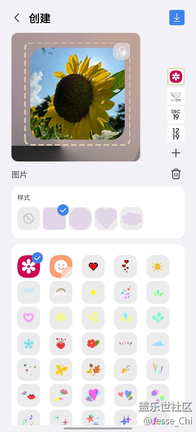 4、锵锵~进入了DIY界面,下方会有大量的预制样式;此外,右上角一栏竖向菜单提供了更加深度的DIY功能,可以任意删除、增加元素或图片或背景