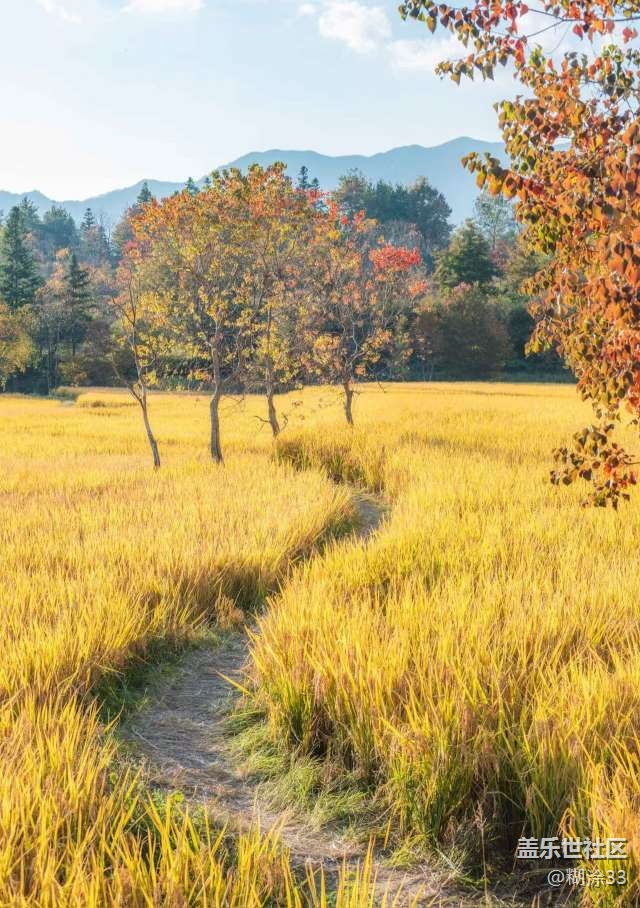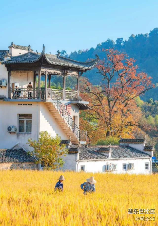 稻田翻涌着金色的浪涛,小径蜿蜒其中,两旁树木红黄绿相间,远处山峦如黛,将田园风光衬得愈发静谧悠远。白墙黛瓦的徽派建筑错落有致,与绚烂的秋叶、金黄的稻田相融,田间农人劳作的身影,为这幅画卷添上了灵动的烟火气。