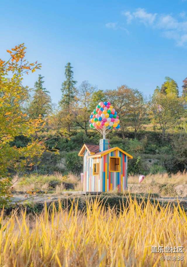 村落旁的树木或橙或黄,与白墙黑瓦的民居构成独特的皖南秋景,漫步乡间小径的行人,在这片宁静中享受着秋日的温柔。水牛在彩林间悠然伫立,彩色的童趣小屋点缀在金色稻田边,传统与童趣在此碰撞,让皖南的秋既有古朴的诗意,又有灵动的意趣。