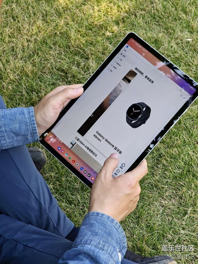 它没有夸张的设计,背板仅用简洁的“SAMSUNG”标识和一颗摄像头做点缀,带着细腻的高级感;边角的微弧过渡,让手持时的贴合度柔和了不少——就像图里那样,握着它在户外写写画画,也不会觉得硌手。