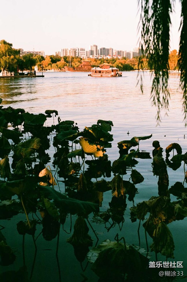 傍晚的风裹着秋意,漫过湖边的残荷。柳丝垂在岸沿,把远处的亭台和游船滤成朦胧的画——木船荡开金粉似的波光,檐角在夕照里浮着暖调,城市的楼群隐在树后,倒像给这湖景镶了道淡远的边。