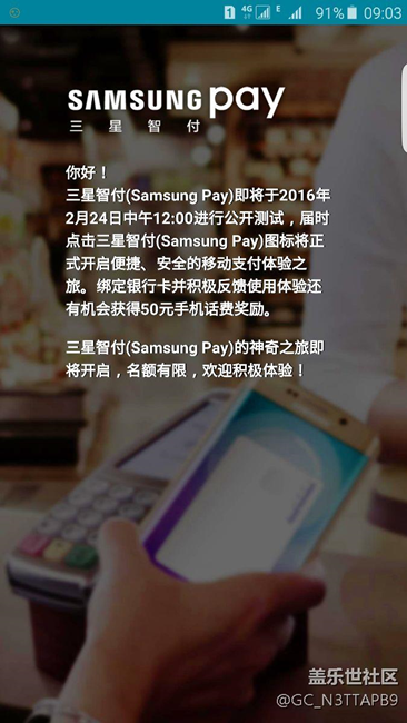 2016.2.21系统自动升级后多了一个samsungpay的图标,很期待的点开,失望的看到耍等24日中午12:00,可是盼到时间直接点不开了,到了17:00,显示不能参加测评了,很失望