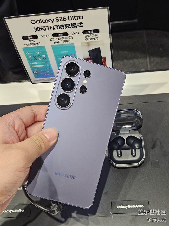 今天酋长给我们介绍了S26的升级细节和亮点,防窥屏和摄像头的光圈提升是最吸引我的,这次充电也提升到了60w真的是太棒啦,这次的紫色也很好看,真不错心动了
