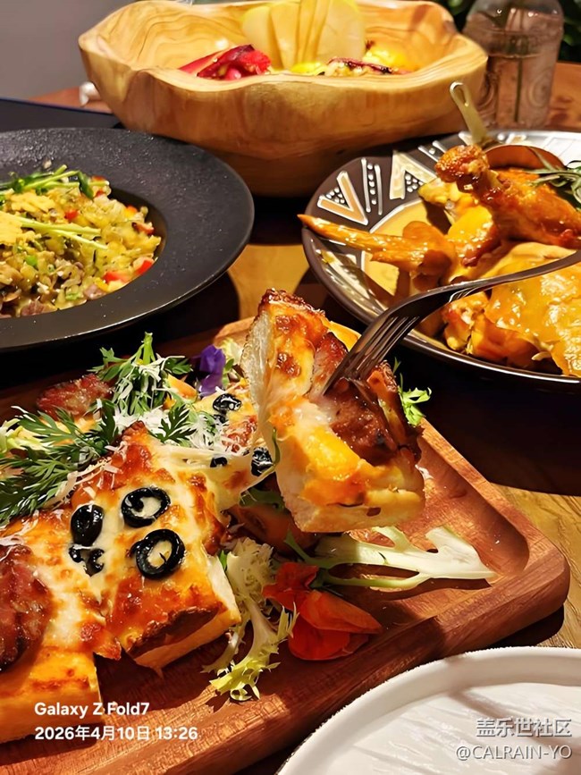 暖光轻吻木质餐盘,芝士熔岩般漫过厚吐司,黑橄榄如墨玉缀在金黄焦香上,叉子挑起的刹那,肉香与奶香在空气里织成温柔的网;烤鸡裹着琥珀色酥皮,迷迭香与秋葵、小胡萝卜依偎成田园诗,连炒饭都盛着青蔬的鲜灵,每一道餐食都在时光里酿出烟火的诗意,仿佛味蕾正奔赴一场与美味的浪漫私奔。