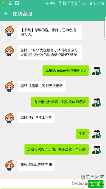 看到s6更新,打算问问客服大E何时推送,结果客服也不敢打包票了,估计三星跳票忒狠,不知道是程序猿的事儿还是运营商的事儿,此处仅表达心中不满,实已无力吐槽