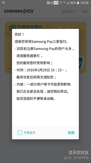 今天绑卡费了九牛二虎之力绑上了民生的卡,光大卡无论怎样都绑定不上,才等现在绑定吧,又出来个这,看图片。三星啊,不行你别装逼跟人家果果学啊,,,,,