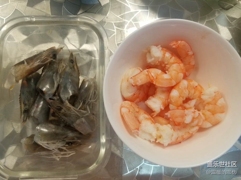 海虾去皮去虾线,皮虾仁煮熟,虾头备用